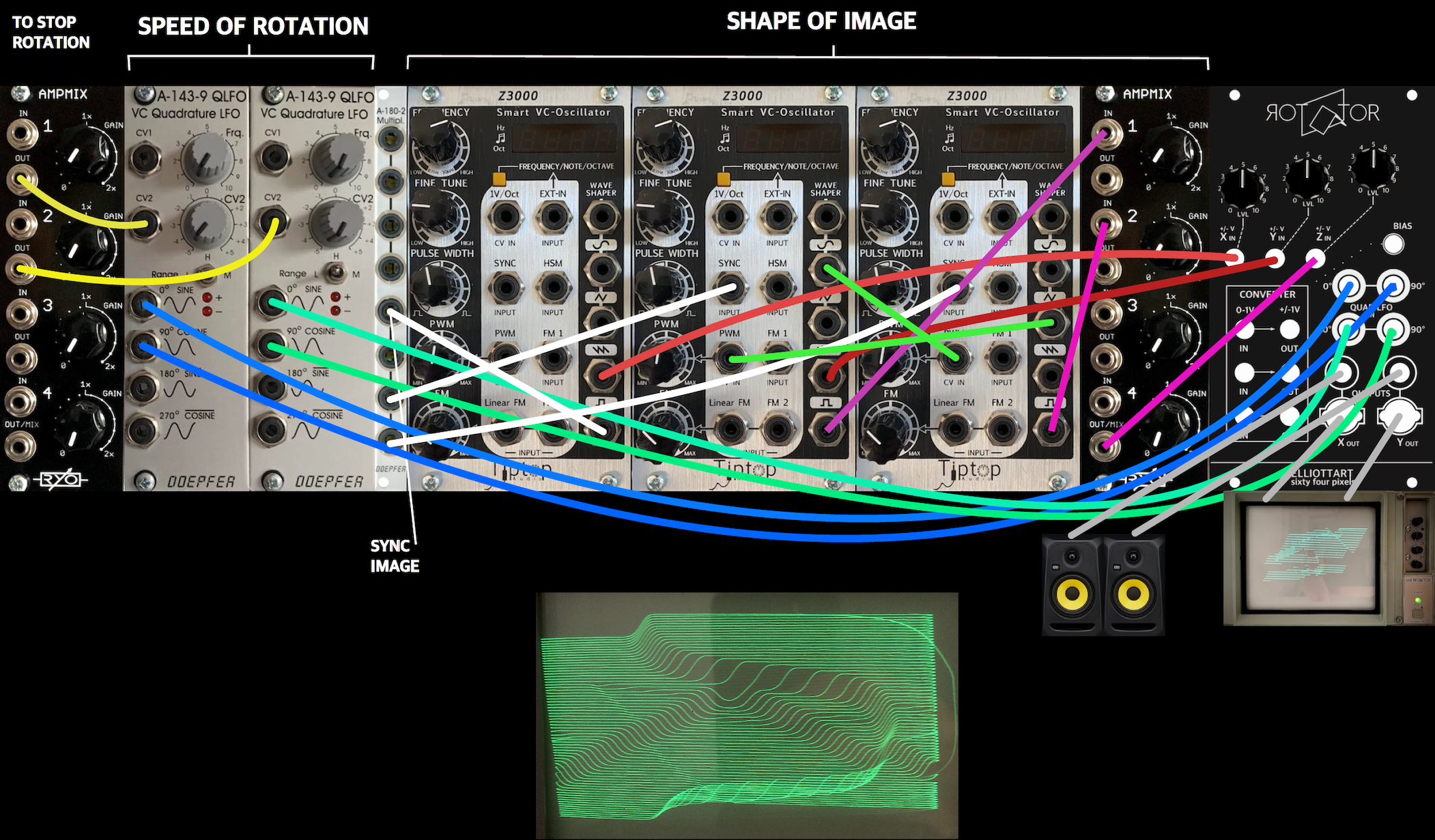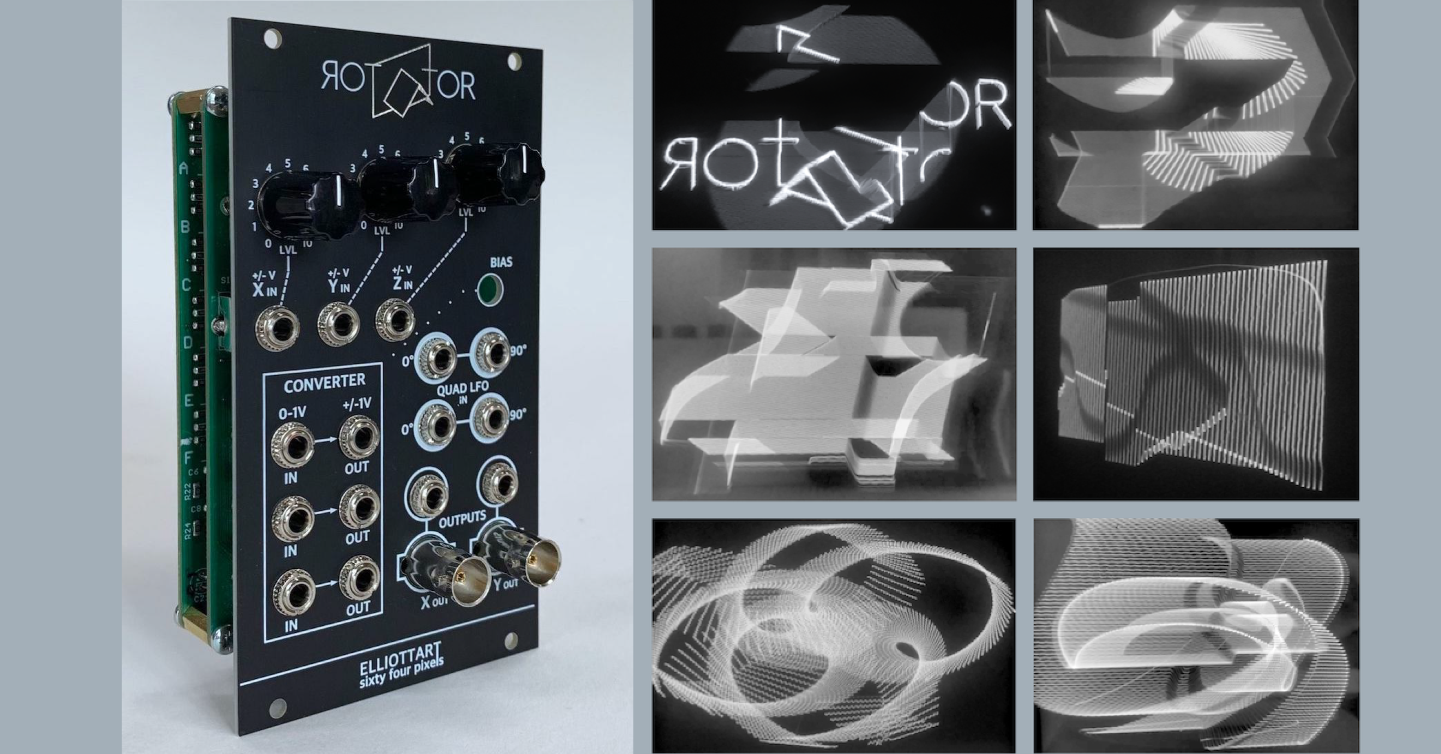 The Rotator is a powerful analogue processor that creates a three dimensional image on any XY oscilloscope or vector monitor. You can input Eurorack audio and/or Video frequencies to make your image, patch 2 Quadrature LFO modules to rotate at your desired speed creating an array of movement and visual effects……